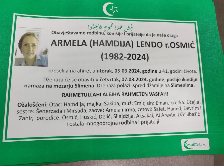 Tužnim srcem javljamo rodbini, prijateljima, komšijama i poznanicima žalosnu vijest da nam je naša draga Armela (Hamdija) Lendo r. Osmić dana 05.03.2024. godine u 41. godini života preselila na Ahiret.