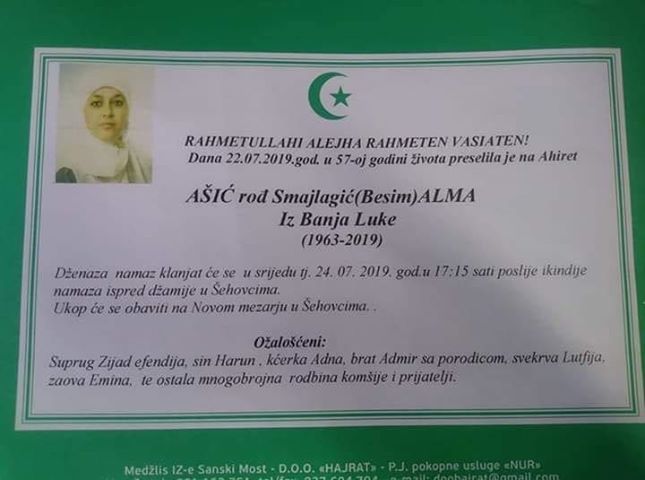 Tužnim srcem i bolim u duši javljamo rodbni, prijateljima, komšijama i poznanicima da je dana 22.07.2019. godine u 57-oj godini života na Ahiret preselila Ašić ( rođena Smajlagić) (Besim) Alma.