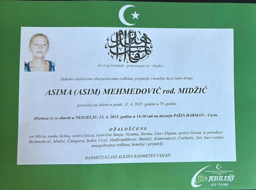 Tužnim srcem javljamo rodbini, prijateljima i komšijama da je dana 11.04.2025. god. u 79-oj godini života na ahiret preselila ASIMA (Asim) MEHMEDOVIĆ rođ. MIDŽIĆ