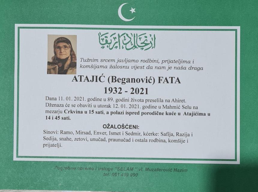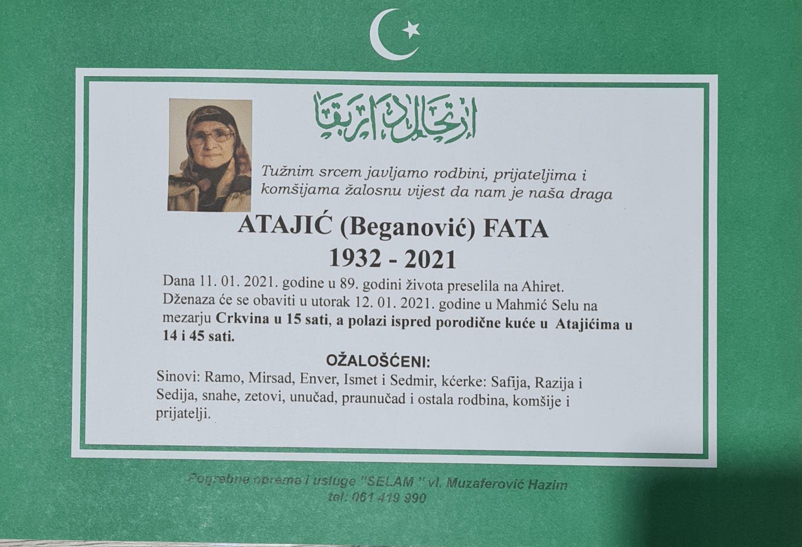 Tužnog srca i s bolom u duši obavještavamo rodbinu, komšije i prijatelje da je naša draga Atajić (Beganović) Fata preselila na Ahiret, dana 11. 1. 2021. godine, u 89. godini života