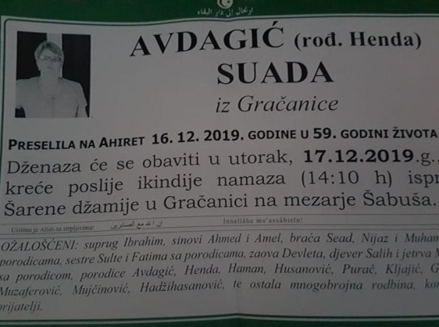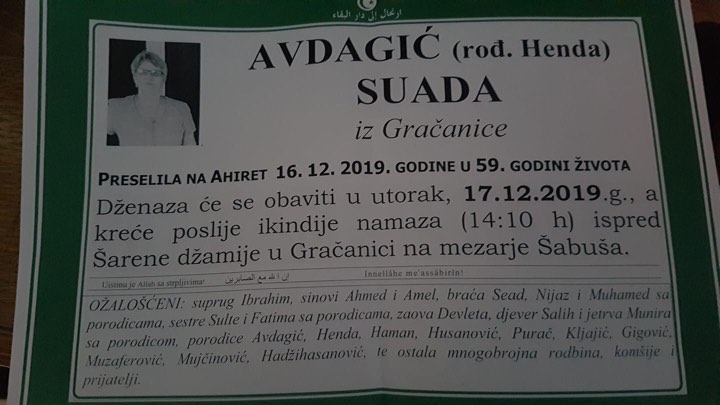 Javljamo rodbini, prijateljima, komšijama i poznanicima da je 16.12.2019. godine u 59. godini života na Ahiret preselila Avdagić (rođ. Henda) Suada.