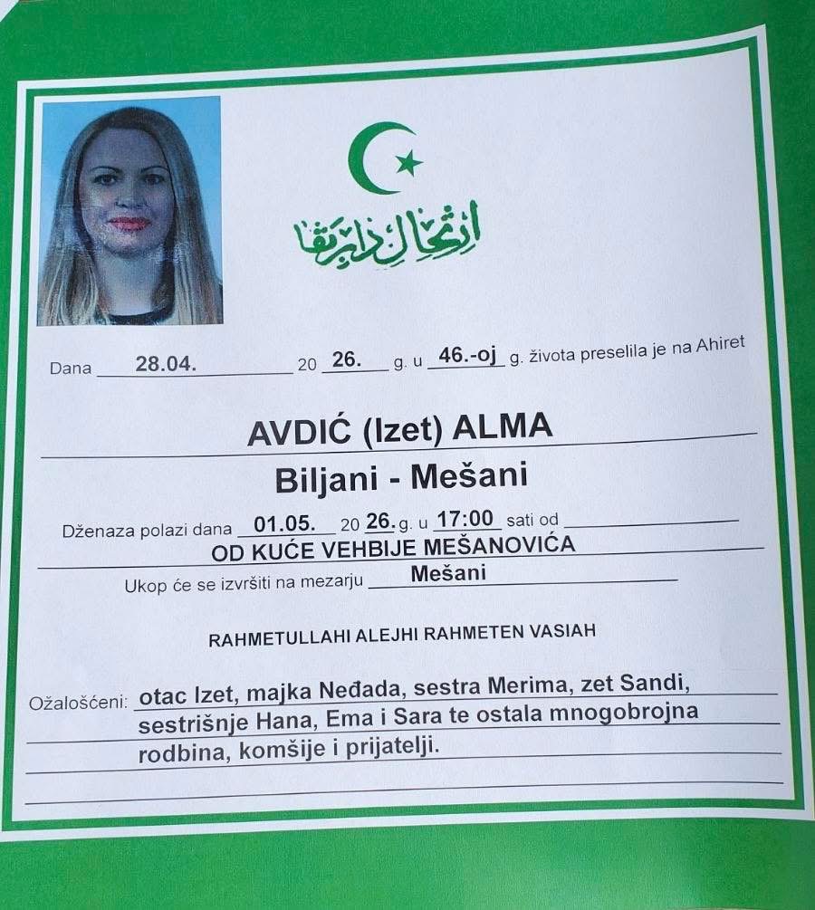 Dženaza polazi dana 01.05.2026. godine u 17:00 sati od OD KUĆE VEHBIJE MEŠANOVIĆA
