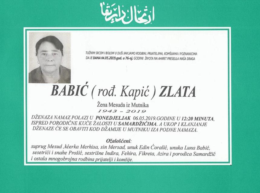 Tužnim srcem i bolom u duši javljamo rodbini, prijateljima, komšijama i poznanicima da je dana 04.05.2019. godine u 76. godini života na Ahiret preselila Babić (rođ.Kapić) Zlata.