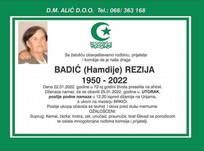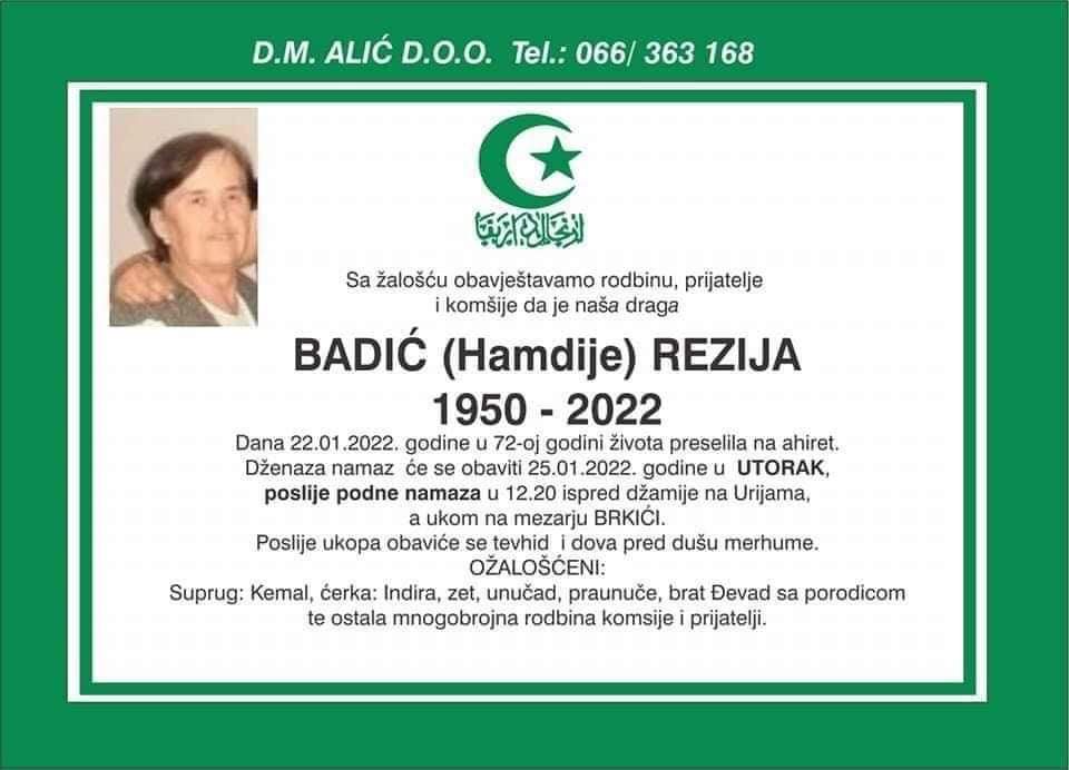 Tužnog srca i s bolom u duši obavještavamo rodbinu, komšije i prijatelje da je naša draga Badić (Hamdije) Rezija u 72. godini života dana 22.1.2022. preselila na ahiret.