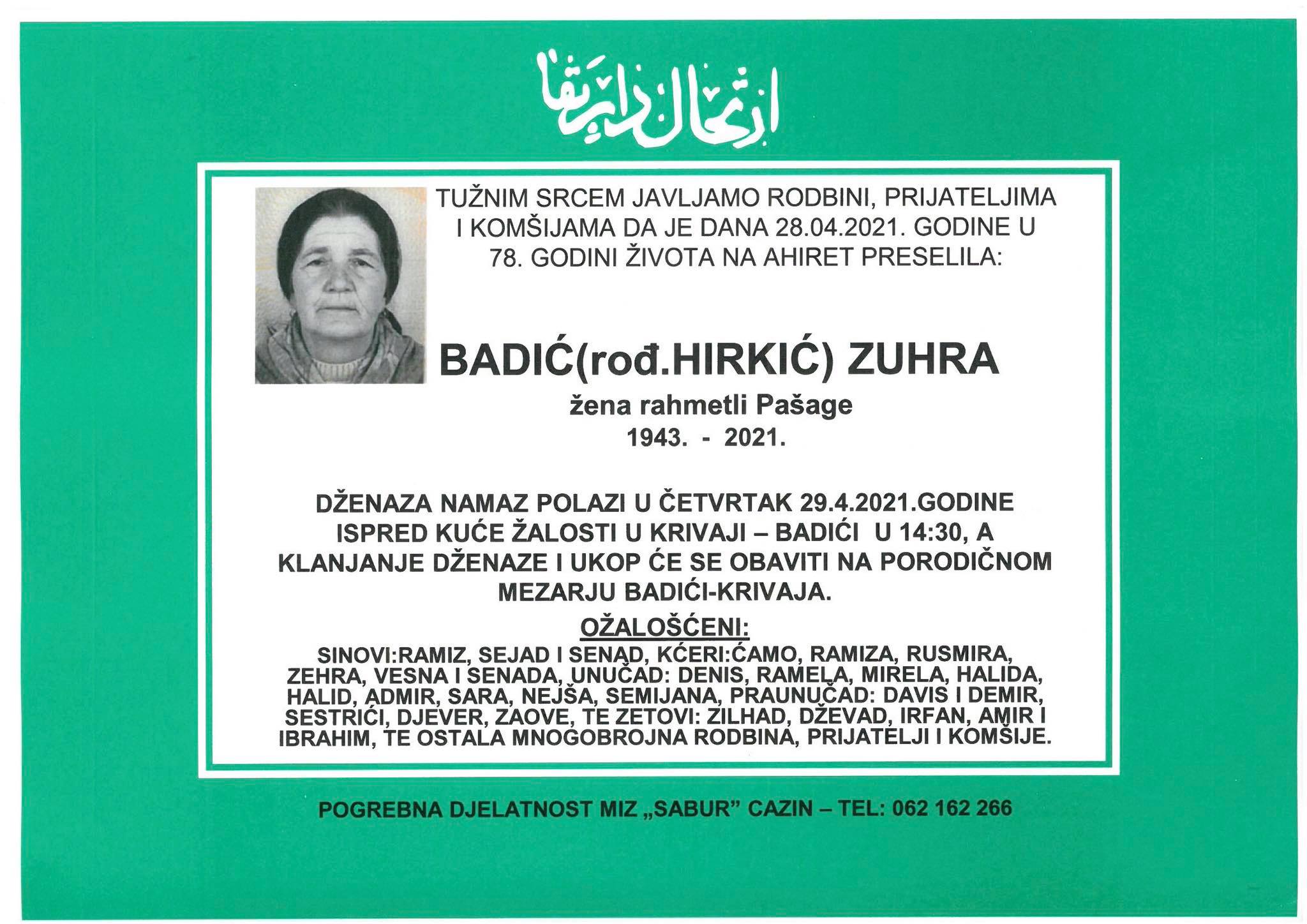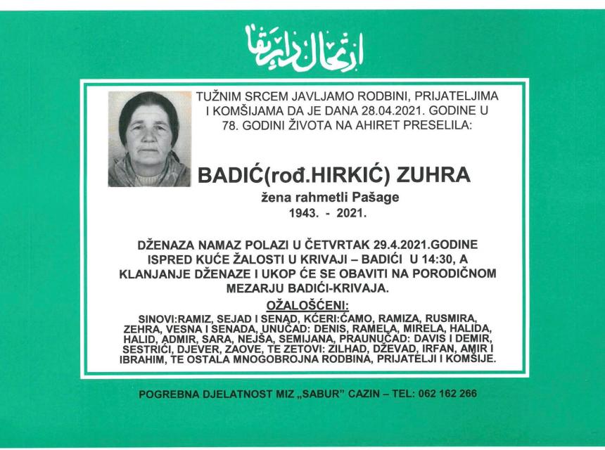 Tužnog srca i s bolom u duši obavještavamo rodbinu, komšije i prijatelje da je naša draga Badić (rođ. Hirkić) Zuhra, dana 28.04.2021 godine, u 78-oj godini života, preselila na Ahiret.