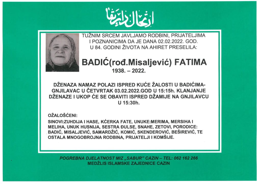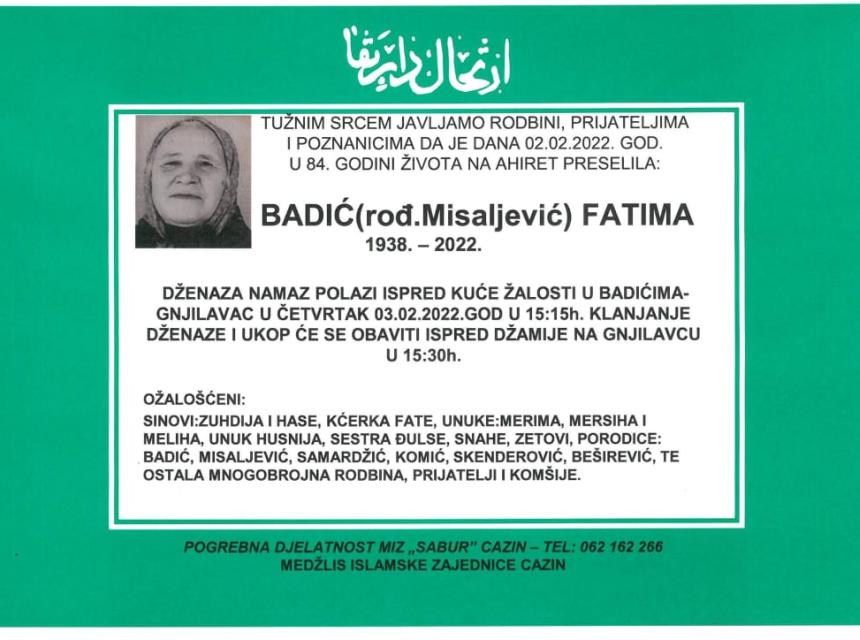 Tužnog srca i s bolom u duši obavještavamo rodbinu, komšije i prijatelje da je naša draga Badić (rođ. Misaljević) Fatima, dana 02.02.2022. godine, u 84-oj godini života, preselila na Ahiret.