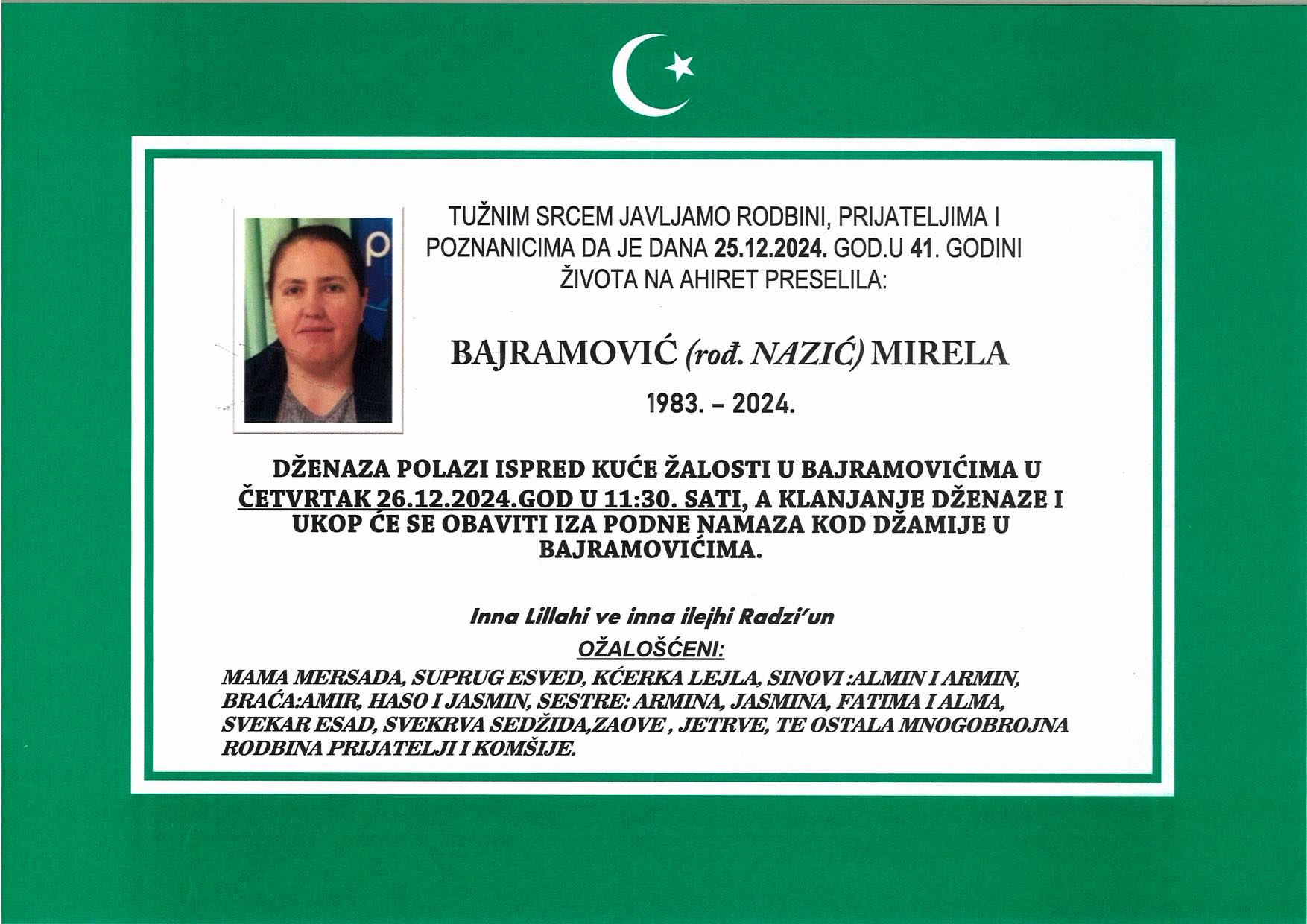 Dženaza polazi ispred kuće žalosti u Bajramovićima u četvrtak 26.12.2024. godine, u 11:30 a klanajnje i ukop će se obaviti iza podne namaza kod džamije u Bajramovićima.