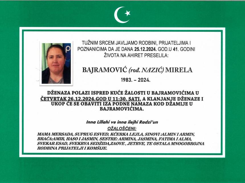 Duboko ožalošćeni obavještavamo rodbinu, prijatelje i komšije da je dana 25.12.2024. god. u 41-oj godini života na ahiret preselila Bajramović (rođ. Nazić) Mirela.