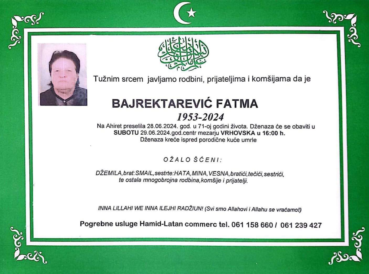 Tužnim srcem javljamo rodbini prijateljima i komšijama da je Bajrektarević Fatima na Ahiret preselila 28.06.2024. godine u71-oj godini života.