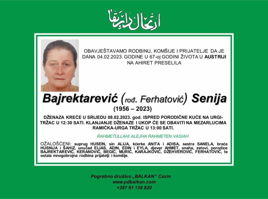Sa žalošću javljamo rodbini, prijateljima i poznanicima da je naša draga Bajrektarević (rođ. Ferhatović) Senija dana 04.02.2023 godine preselila na Ahiret u 67 godini života.