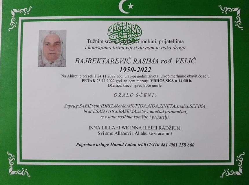 Tužnim srcem javljamo rodbini, prijateljima i komšijama tužnu vijest da nam je naša draga Bajrektarević rođ. Velić Rasima na Ahiret preselila 24.11.2022. god. u 73-oj godini života.