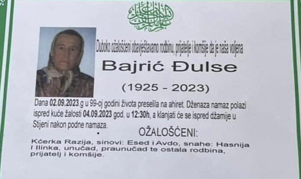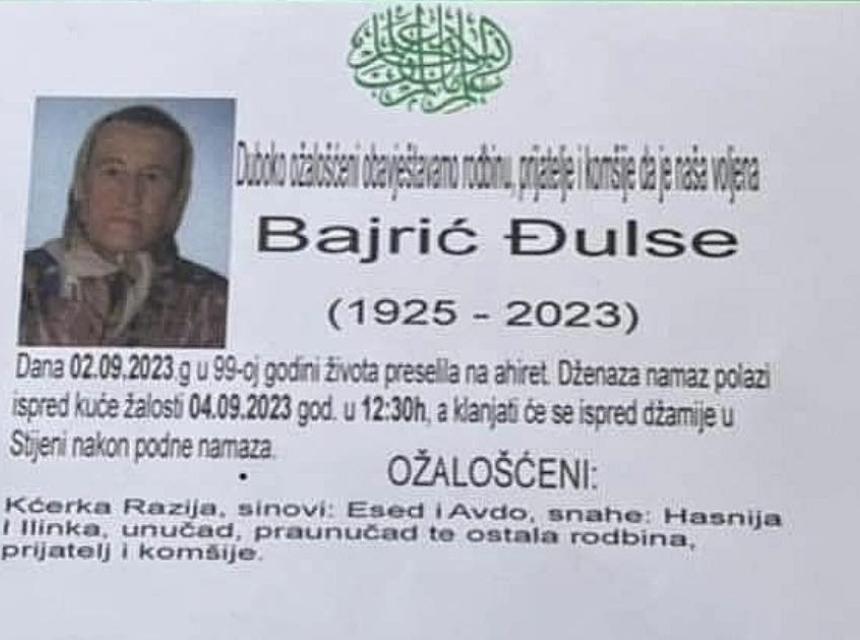 Duboko ožalošćeni obaveštavamo rodinu, priatele komisije da je svoje Bajrić Dulse dana 02.09.2023 gu 99-oj godini života presella na Ahiret.