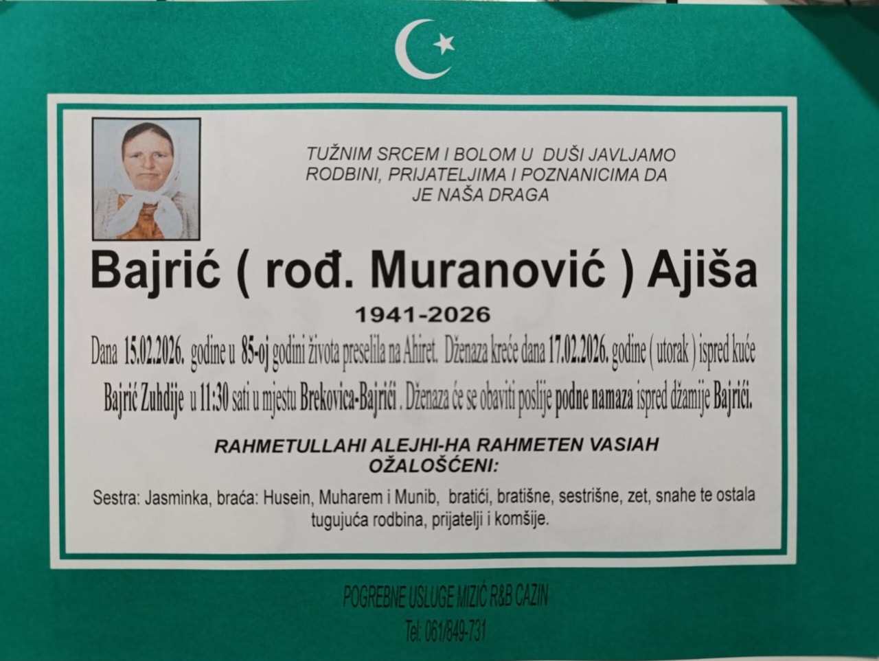 Dženaza kreće dana 17.02.2026. godine (utorak ) ispred kuće Bajrić Zuhdije u 11:30 sati u mjestu Brekovica-Bajrići. Dženaza će se obaviti polije podne namaza ispred džamije Bajrići.