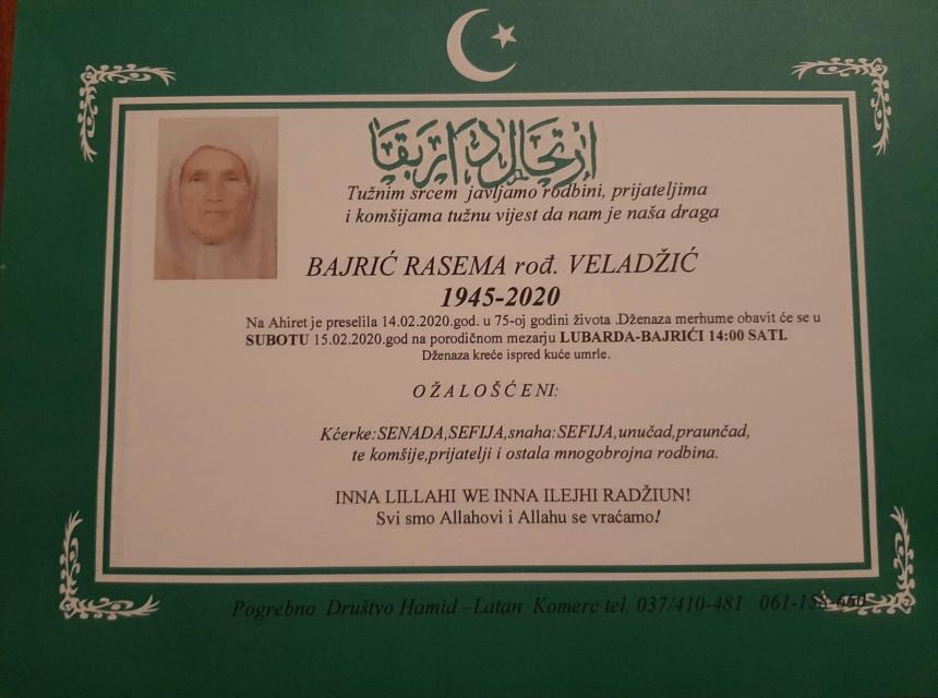 Tužnim srcem i bolom u duši javljamo rodbini i prijateljima da je naša draga i nikad prežaljena Bajrić (rođ.Veladžić) Rasema, dana 14.02.2020. godine u 75-toj godini života preselila na Ahiret.