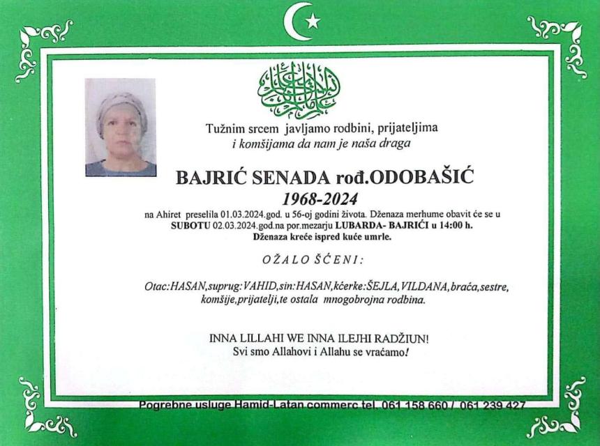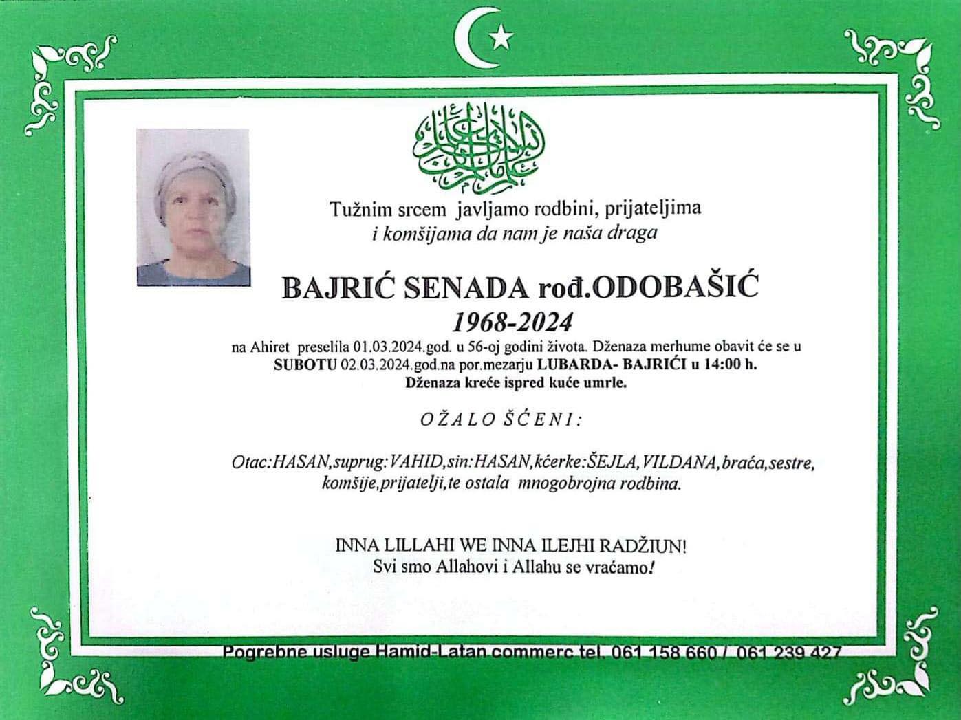 Tužnim srcem javljamo rodbini, prijateljima, komšijama i poznanicima žalosnu vijest da nam je naša draga Bajrić Senada rođ. Odobašić dana 01.03.2024. godine u 56. godini života preselila na Ahiret.