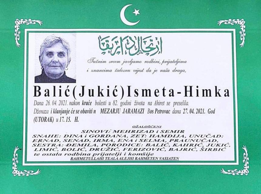 Tužnog srca i s bolom u duši obavještavamo rodbinu, komšije i prijatelje da je naša draga Balić (Jukić) Ismeta-Himka, dana 26.04.2021 godine, u 82-oj godini života, preselila na Ahiret.