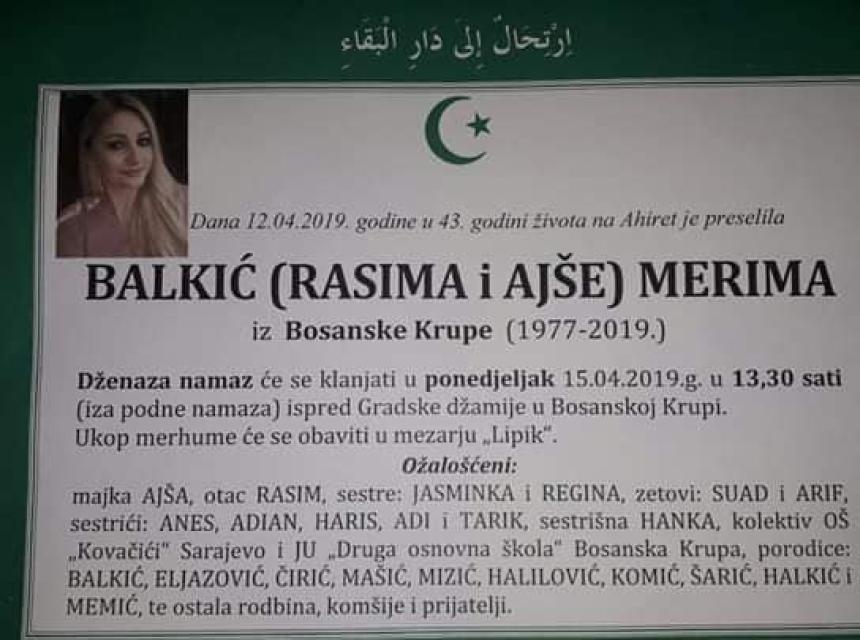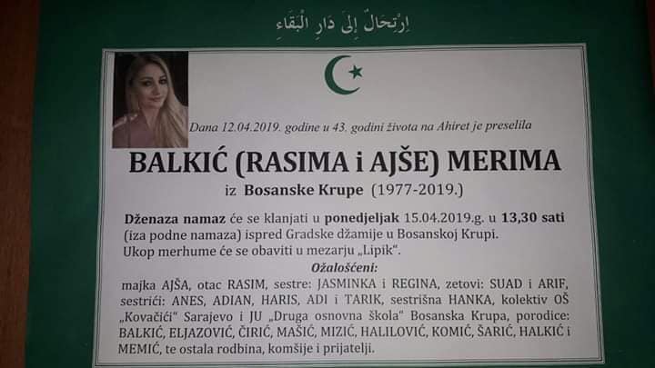 Tužnim srcem i bolom u duši, obaviještavamo rodbinu, komšije i prijatelje da je 12.04.2019.g. u 43.godini života, na Ahiret preselila Balkić (Rasima i Ajše) Merima iz Bosanske Krupe.