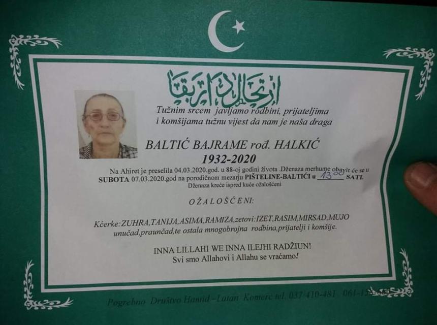 Tužnog srca i s bolom u duši obavještavamo rodbinu, komšije i prijatelje da je 20.02.2020. godine naša draga i nikad prežaljena Baltić Bajrame rođ. Halkić u 88. godini života preselila na Ahiret.
