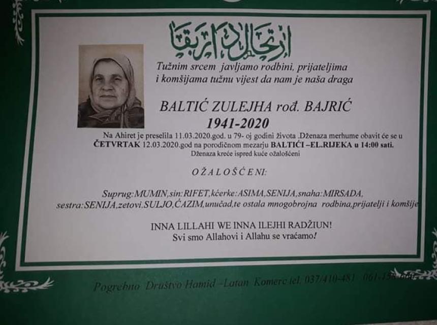 Dženaza namaz obaviće se u četvrtak 12.03.2020. god na porodičnom mezarju Baltić - EL. Rijeka u 14:00 sati. Dženaza kreće ispred kuće ožalošćeni.