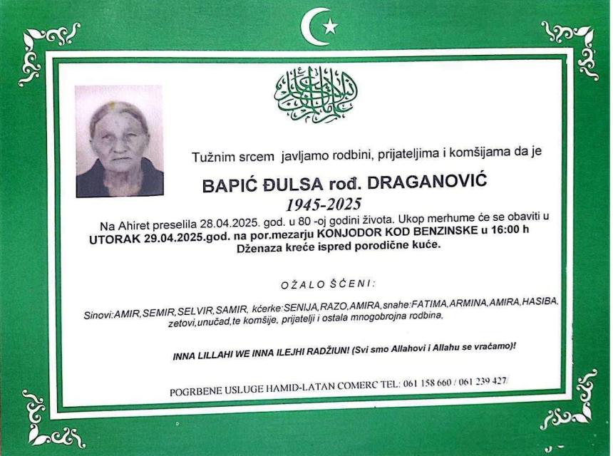 Na Ahiret preselila 28.04.2025. god. u 80-oj godini života. Ukop merhume će se obaviti u