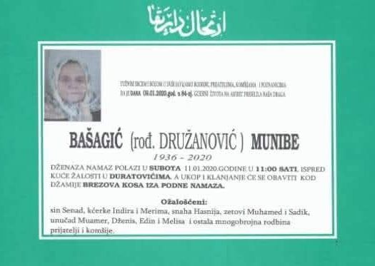 Tužnim srcem i bolom u duši javljamo rodbini, prijateljima i komšijama da je naša draga BAŠAGIĆ (rođ. DRUŽANOVIĆ) MUNIBE preselila na Ahiret.