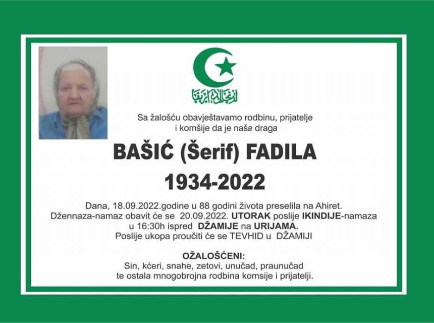 Tužnim srcem i bolom u duši javljamo rodbini, prijateljima i komšijama da je dana 18.09.2022.god. u 88. godini života na Ahiret preselila Bašić (Šerif) Fadila.