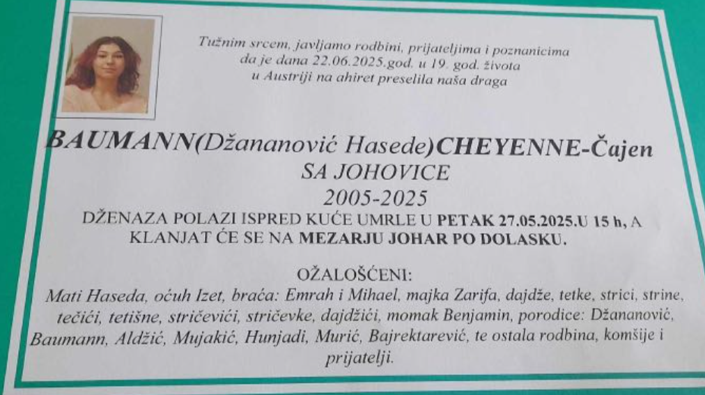 Tužnim srcem i bolom u duši javljamo rodbini, prijateljima i komšijama da je naša draga Baumann (Džananović Hasede) Cheyenne – Čajen, dana 22.06.2025. godine u 19. godini života, preselila na Ahiret.