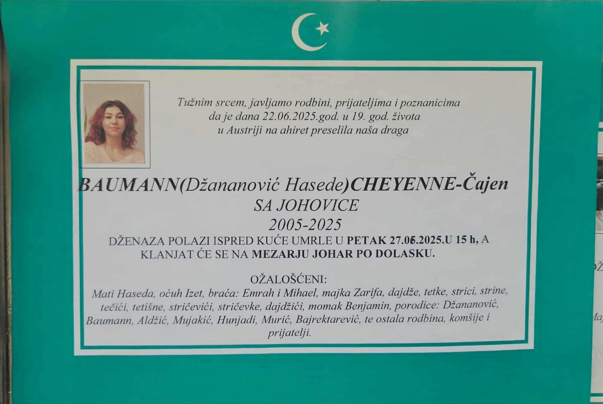 Tužnim srcem, javljamo rodbini, prijateljima i poznanicima da je dana 22.06.2025. god. u 19. god. života u Austriji na ahiret preselila naša draga