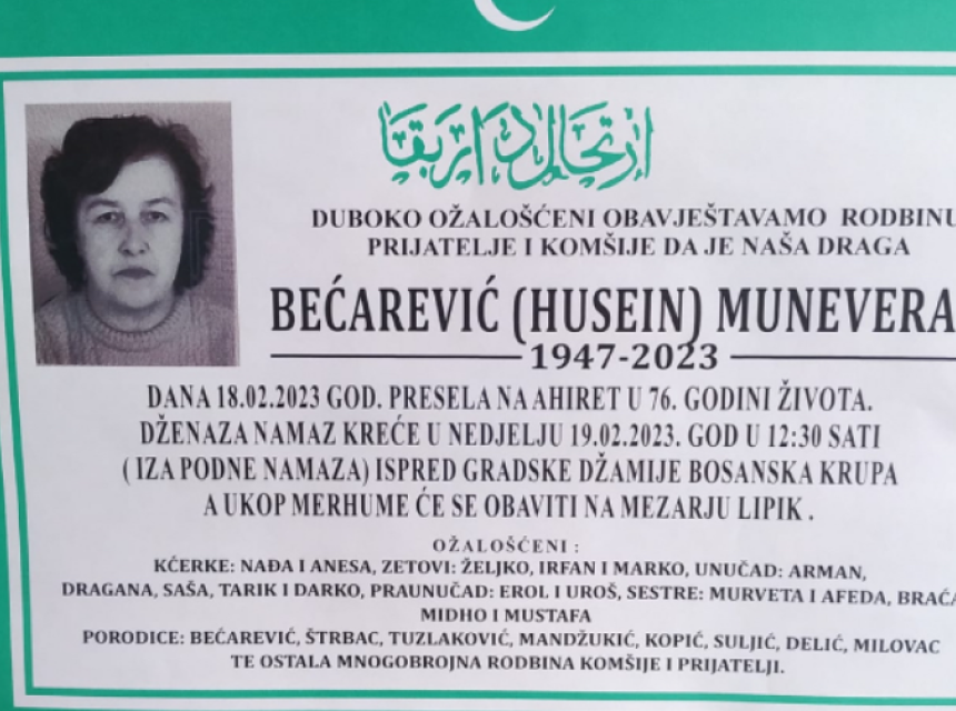 Duboko ožalošćeni obavještavamo rodbinu, priajtelje i komšije da je naša draga Bećarević (Husein) Munevera dana 18.02.2023. godine preselila na Ahiret u 76. godini života.