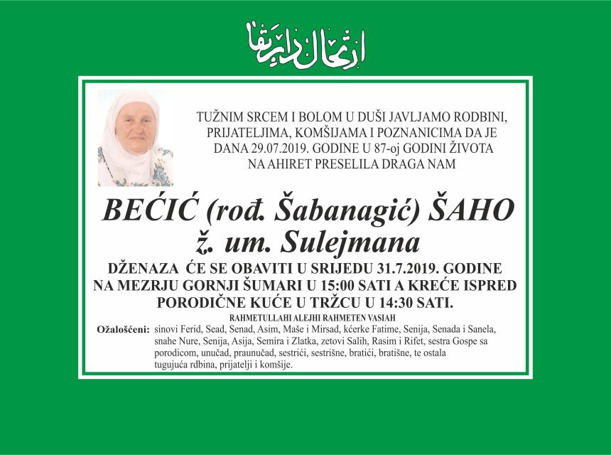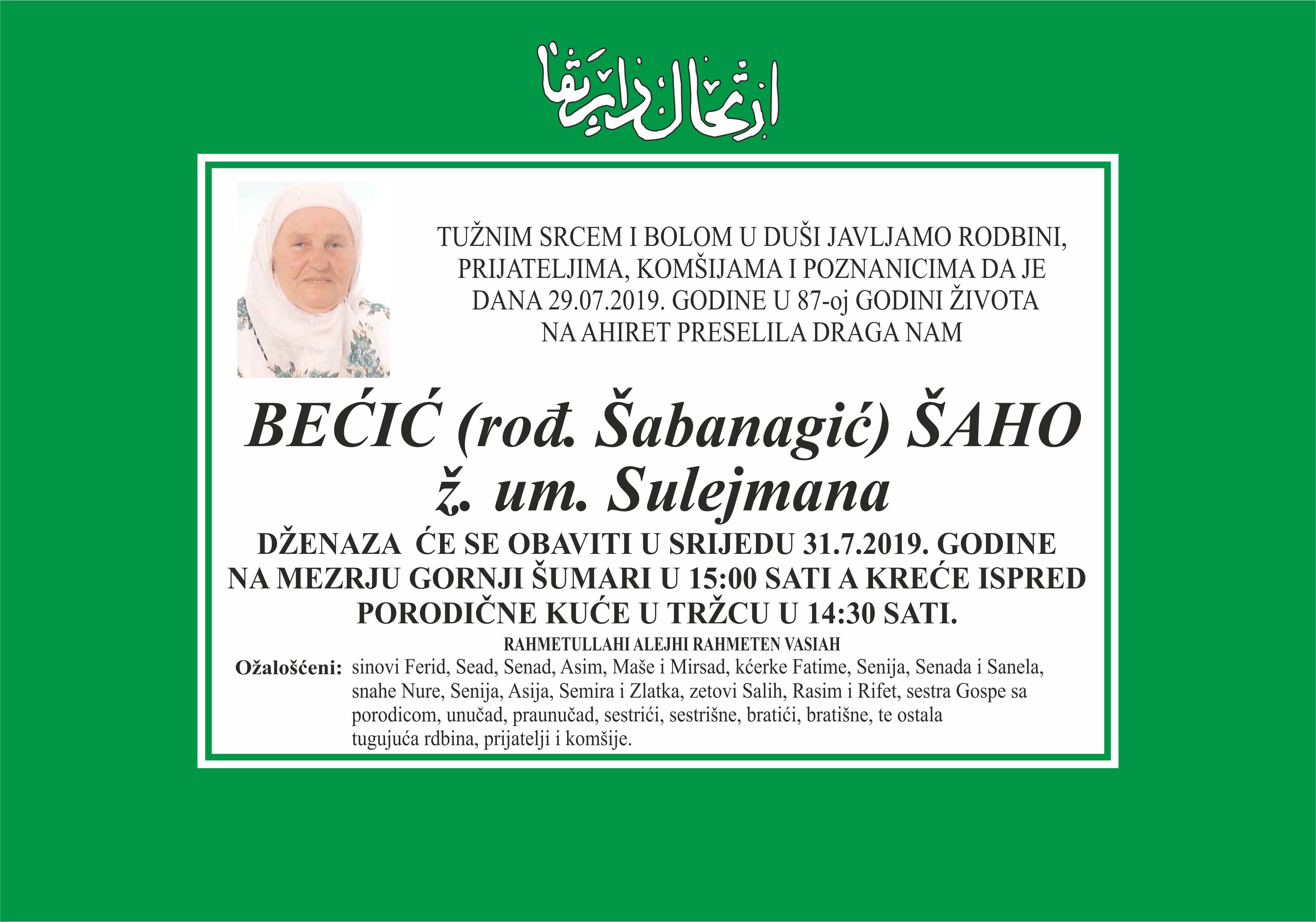 Tužnim srcem i bolom u duši javljamo rodbini, prijateljima, komšijama i poznanicima da je 29.07.2019.god, u 87. godini života preselila na Ahiret Bećić (rođ. Šabanagić) Šaho ž. um. Sulejmana.