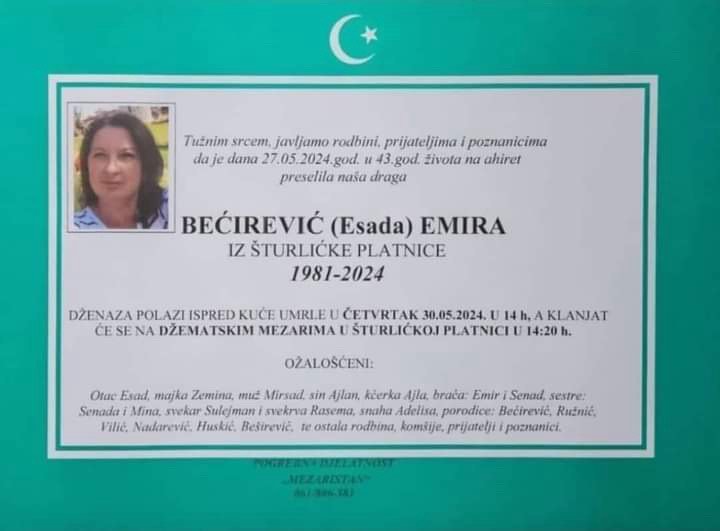 Tužnim srcem javljamo rodbini, prijateljima i komšijama da je Bećirević (Esada) Emira dana 27.05.2024. godine na ahiret preselila u 43-oj godini života.
