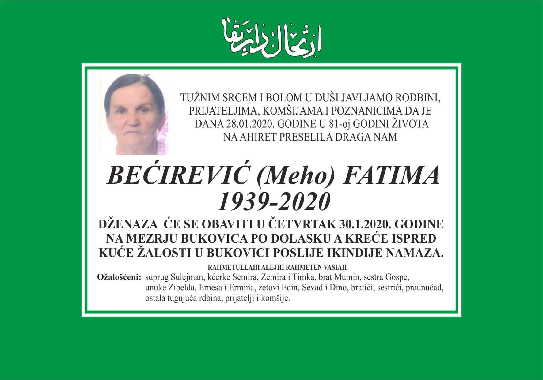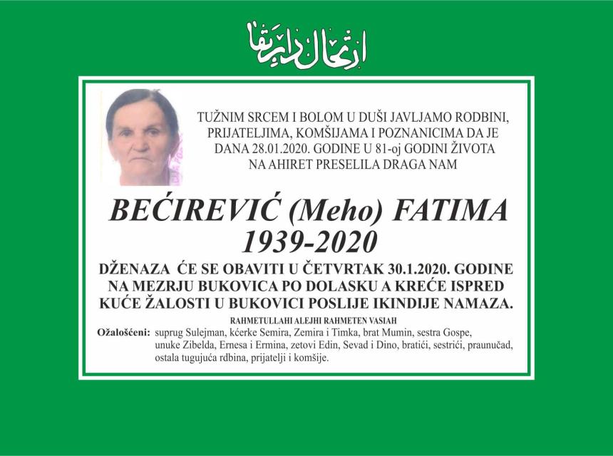 Tužnim srcem i bolom u duši javljamo rodbini i prijateljima da je naša draga i nikad prežaljena Bećirević Fatima dana 28.01.2020. godine u 81-oj godini života preselila na Ahiret.