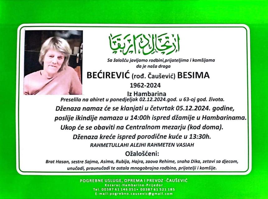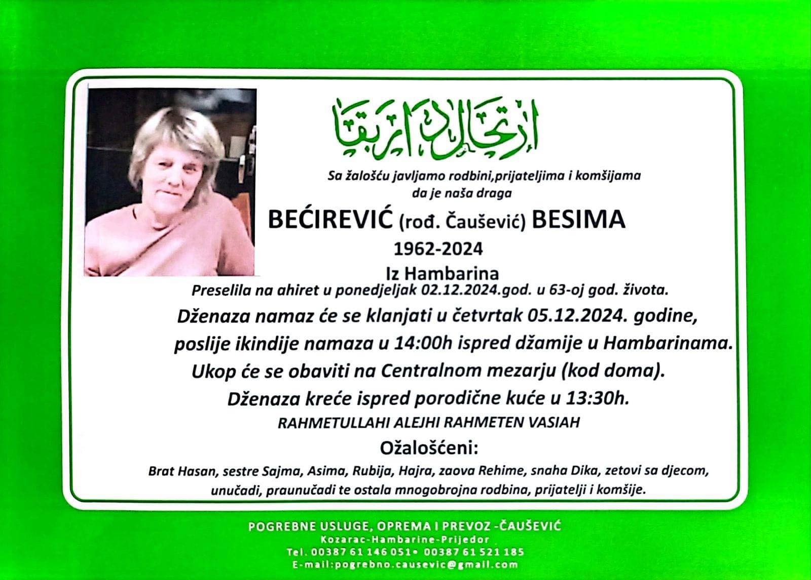 Tužnim srcem i bolom u duši javljamo rodbini, prijateljima i komšijama da je naša draga Bećirević (rođ. Čaušević) Besima, dana 02.12.2024. godine u 63-oj godini života, preselila na ahiret.