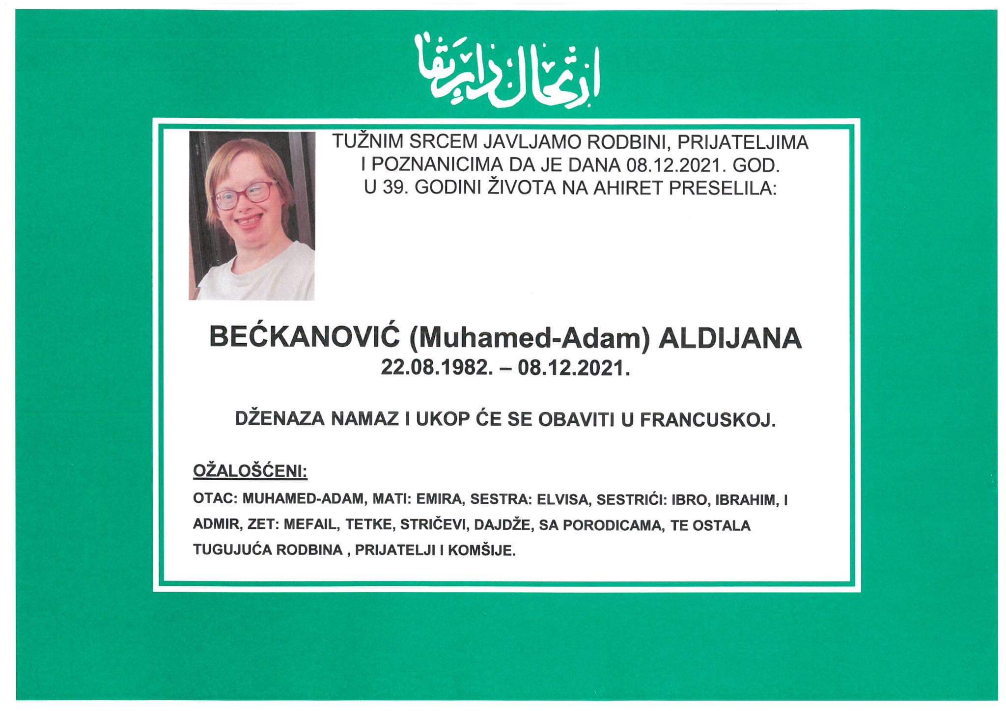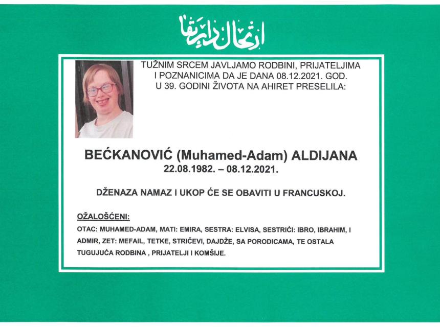 Tužnog srca i s bolom u duši obavještavamo rodbinu, komšije i prijatelje da je naša draga Bećkanović (Muhamed-Adam) Aldijana dana 08.12.2021. u 39. godini života preselila na ahiret.