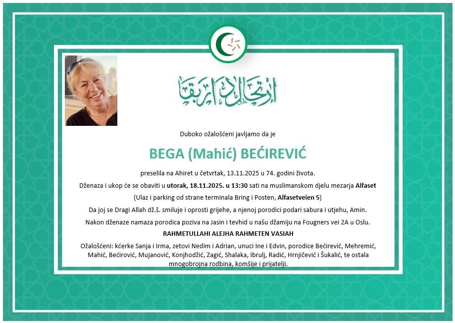 Dženaza i ukop će se obaviti u utorak, 18.11.2025. u 13:30 sati na muslimanskom dijelu mezarja Alfaset