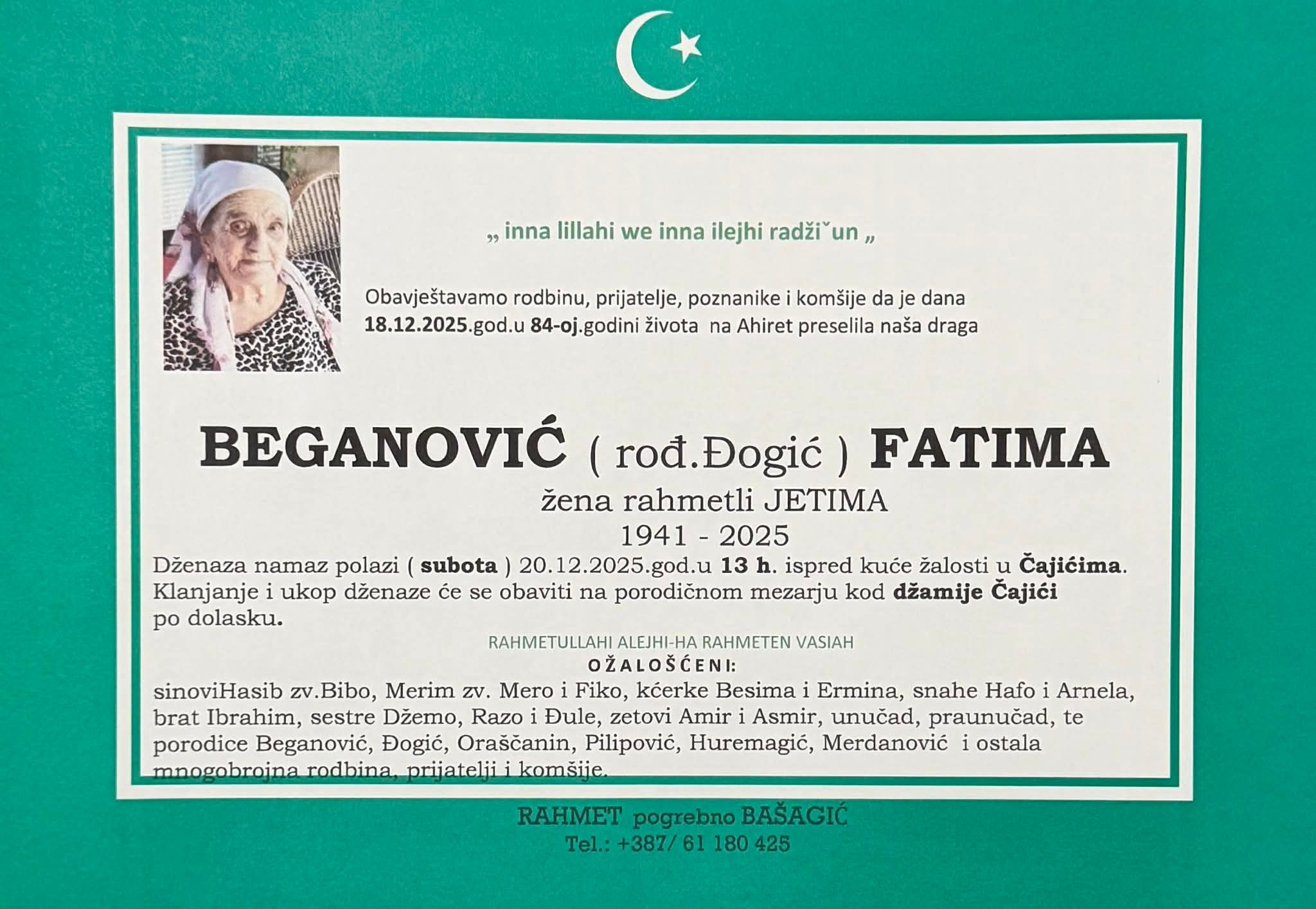 Dženaza namaz polazi (subota) 20.12.2025. god. u 13 h. ispred kuće žalosti u Čajićima.
