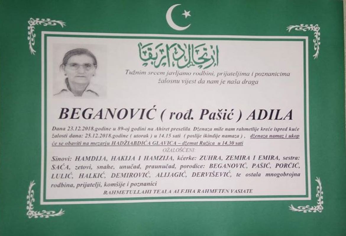 Tužnim srcem javljamo rodbini, prijateljima i poznanicima žalosnu vijest da nam je naša draga Beganović (rođ. Pašić) Adila dana 23.12.2018.godine u 89-oj godini na Ahiret preselila. Dženaza mile nam rahmetlije kreće ispred kuće žalosti dana: 25.12.2018.godine (utorak) u 14:15 sati (poslije ikindije namaza), dženaza namaz i ukop će se obaviti na mezarju Hadžiabdića-Glavica - džemat Ružica u 14:30 sati.