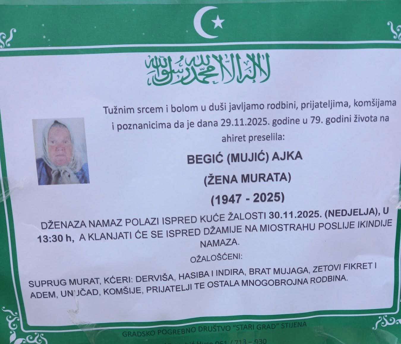 DŽENAZA NAMAZ POLAZI ISPRED KUĆE ŽALOSTI 30.11.2025. (NEDJELJA), U 13:30 h, A KLANJATI ĆE SE ISPRED DŽAMIJE NA MIOSTRAHU POSLIJE IKINDIJE NAMAZA.