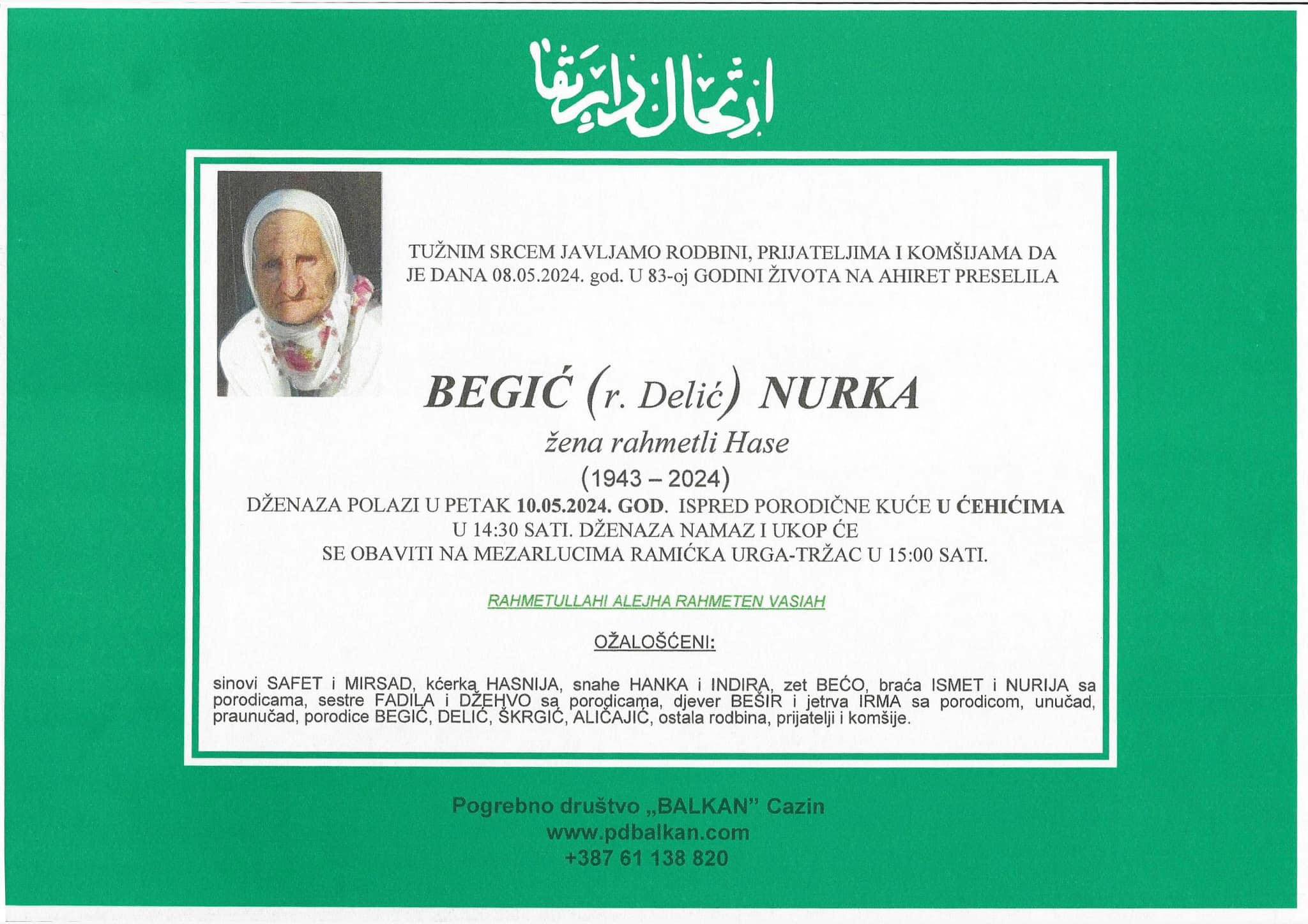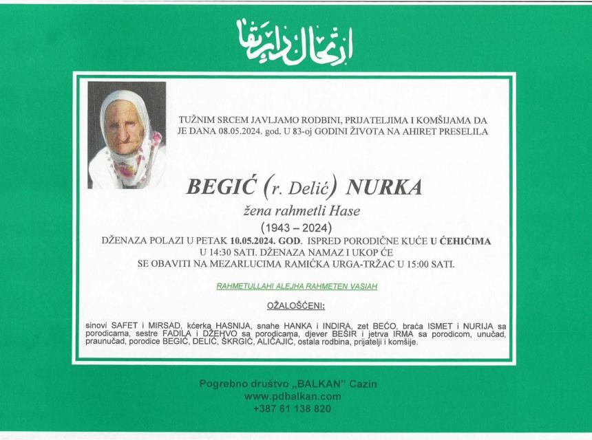 Tužnim srcem javljamo rodbini, prijateljima, komšijama i poznanicima žalosnu vijest da nam je naša draga Begić (rođ. Delić) Nurka dana 08.05.2024. godine u 83. godini života preselila na Ahiret.