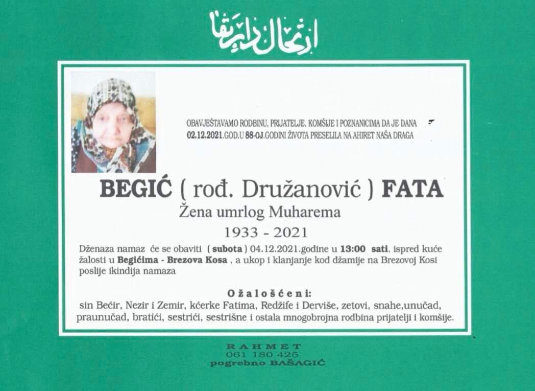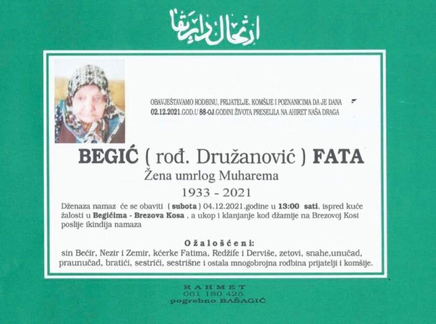 Tužnog srca i s bolom u duši obavještavamo rodbinu, komšije i prijatelje da je naša draga Begić (rođ. Družanović) Fata, dana 02.12.2021. godine, u 88-oj godini života, preselila na Ahiret.