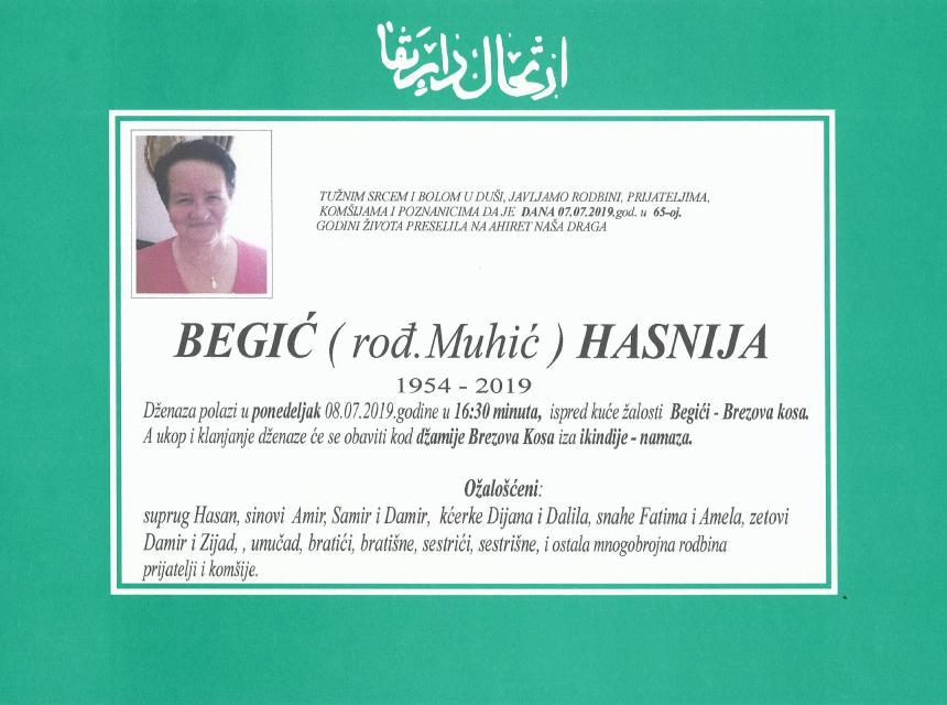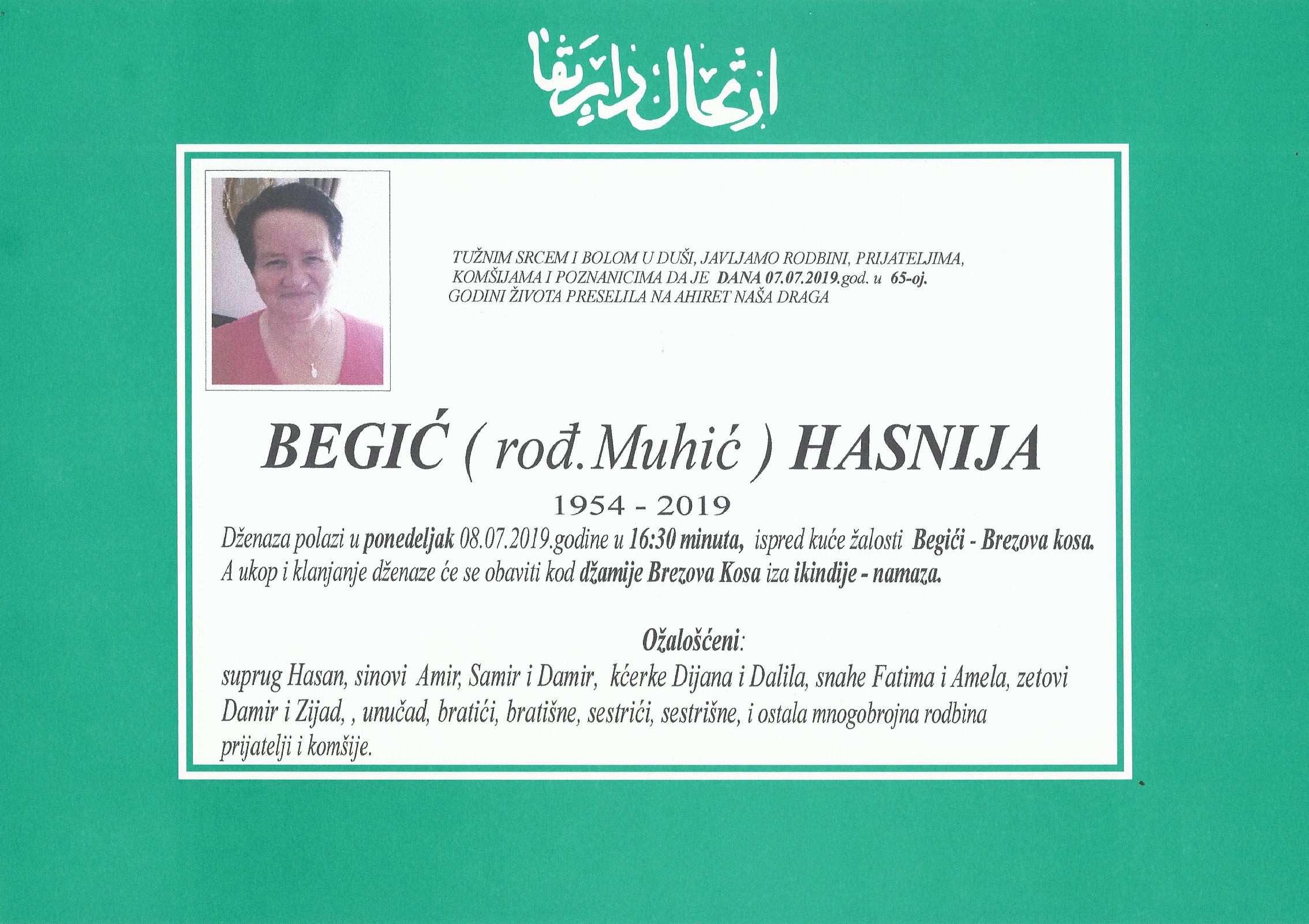 Tužnim srcem javljamo rodbini, prijateljima, komšijama i poznanicima da je dana 07.07.2019.godine u 65. godini života na Ahiret preselila Begić (rođ. Muhić) Hasnija.