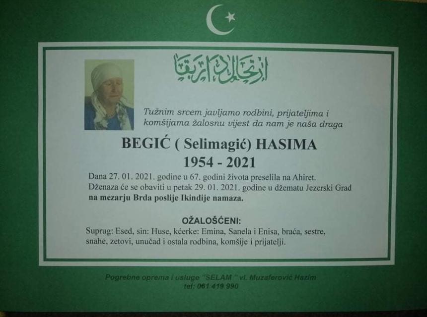 Tužnog srca i s bolom u duši obavještavamo rodbinu, komšije i prijatelje da je naša draga Begić (Selimagić) Hasima, dana 27.01.2021. godine, u 67-oj. godini života, preselila na Ahiret.