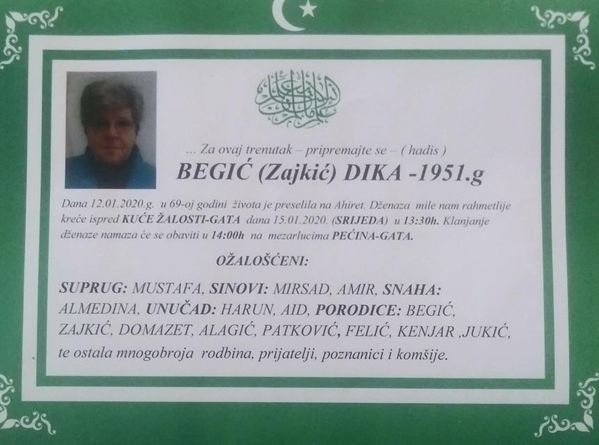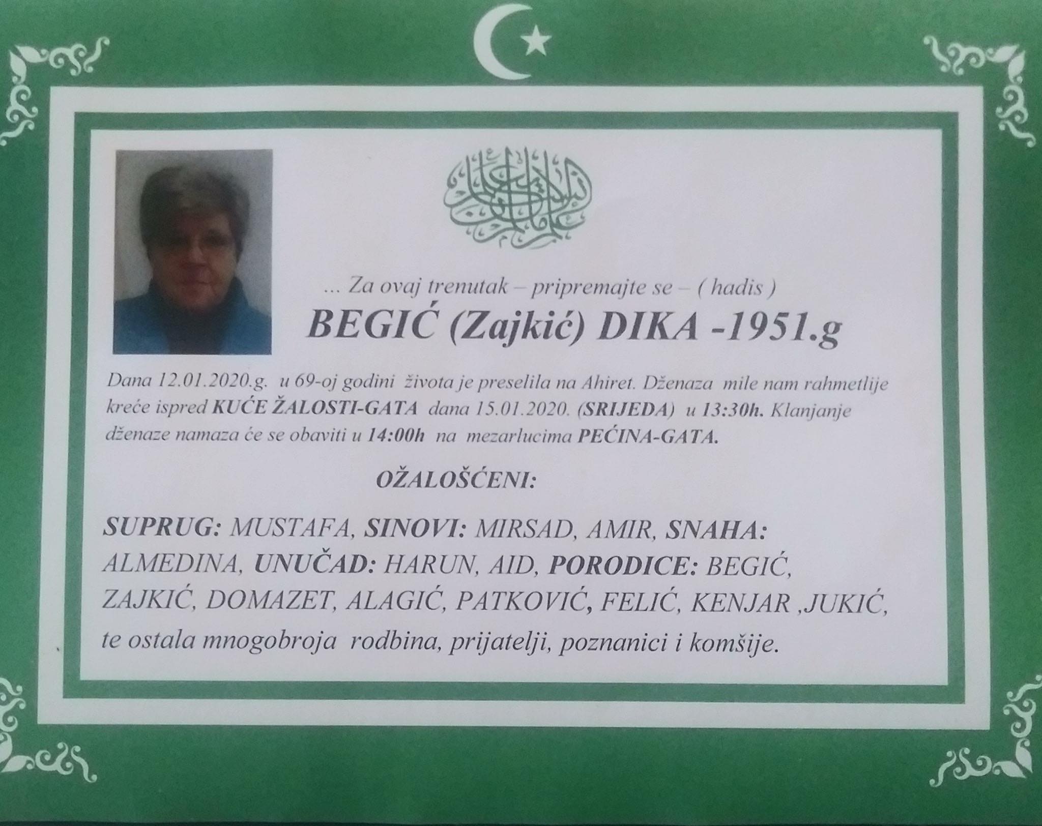Tužnim srcem i bolom u duši javljamo rodbini i prijateljima da je dana 12.01.2020. godine u 69-oj godini života na Ahiret preselila Begić (Zajkić) Dika.