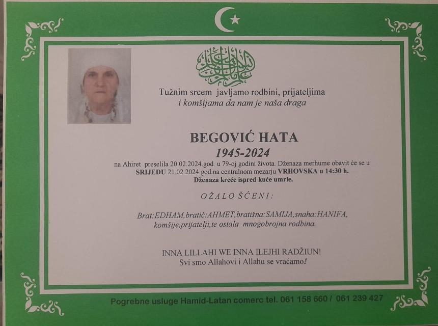 Tužnim srcem javljamo rodbini, prijateljima, komšijama i poznanicima žalosnu vijest da nam je naša draga Begović Hata dana 20.02.2024. godine u 79. godini života preselila na Ahiret.