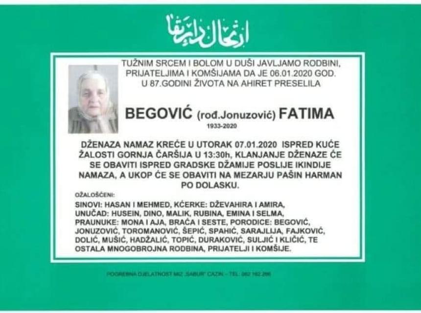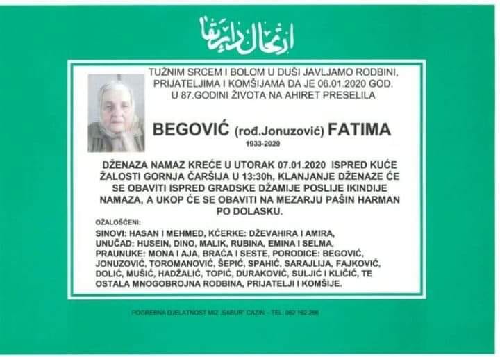 Tužnim srcem i bolom u duši javljamo rodbini, prijateljima i poznanicima da je naša draga Begović (rođ.Junuzović) Fatima dana 06.01.2020.godine preselila na Ahiret u 87-oj godni života.