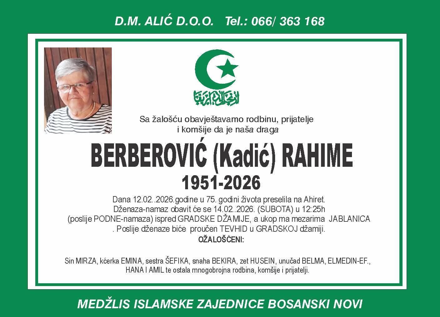 Sa žalošću obavještavamo rodbinu, prijatelje i komšije da je naša draga BERBEROVIĆ (Kadić) RAHIME dana 12.02.2026. godine u 75. godini života preselila na Ahiret.