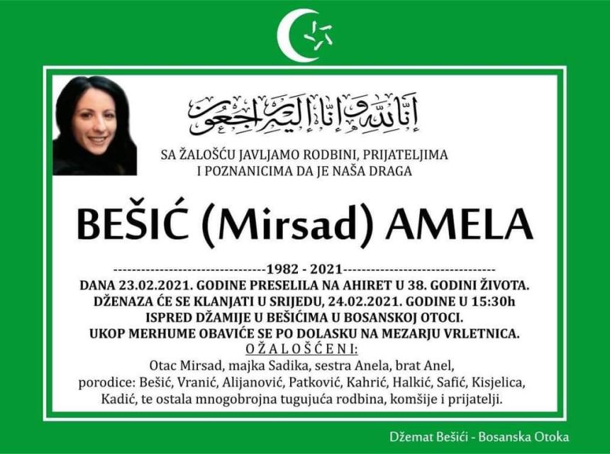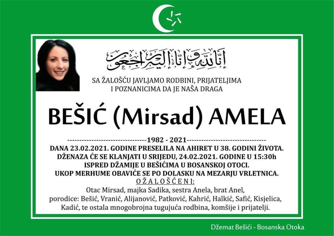 Tužnog srca i s bolom u duši obavještavamo rodbinu, komšije i prijatelje da je naša draga Bešić (Mirsad) Amela, dana 23.02.2021. godine, u 38-oj. godini života, preselila na Ahiret.