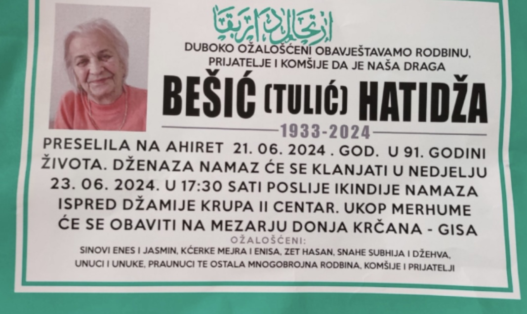 Dženaza namaz će se klanjati u nedjelju 23.06.2024. godine u 17:30 sati poslije ikindije namaza ispred džamije Krupa II Centar.