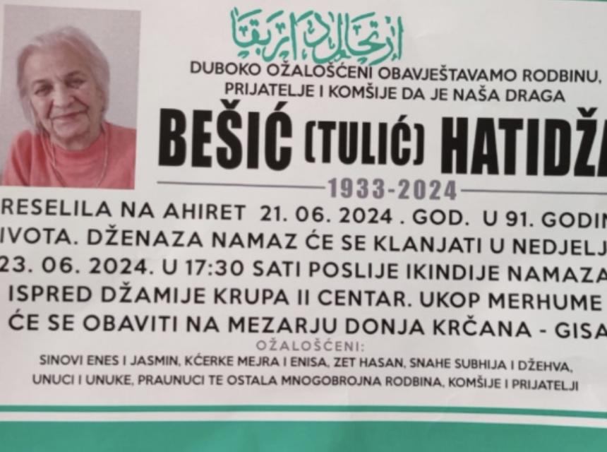 Tužnim srcem i bolom u duši javljamo rodbini, prijateljima i komšijama da je naša draga Bešić (Tulić) Hatidža, dana 21.06.2024. godine u 91-oj godini života, preselila na Ahiret.