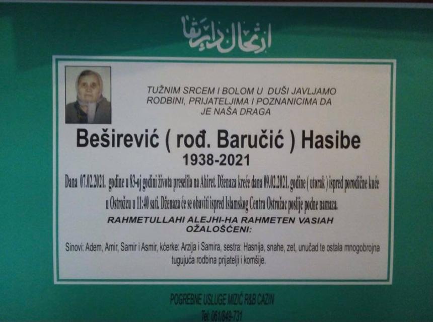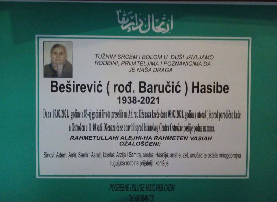 Tužnog srca i s bolom u duši obavještavamo rodbinu, komšije i prijatelje da je naša draga Beširević (rođ. Baručić) Hasibe, dana 07.02.2021. godine, u 83-oj. godini života, preselila na Ahiret.